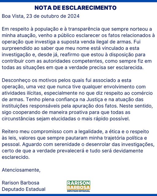Em nota de esclarecimento, o deputado afirma que desconhece os motivos pelos quais foi associado a operação da Polícia Federal. “Nunca tive qualquer envolvimento com atividades ilícitas, especialmente no que diz respeito ao comércio de armas”, disse.