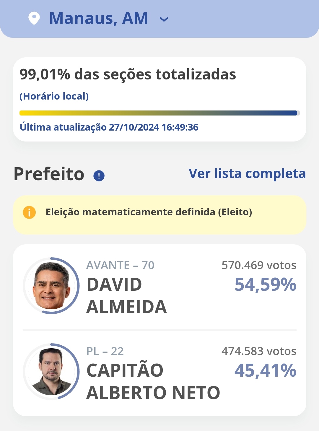 Com quase 100% das urnas apuradas, a eleição está matematicamente definida e David Almeida (Avante) foi reeleito prefeito de Manaus com mais de 54% dos votos, derrotando Alberto Neto (PL), que teve pouco mais de 45% dos votos. A diferença de votos é superior a 100 mil.