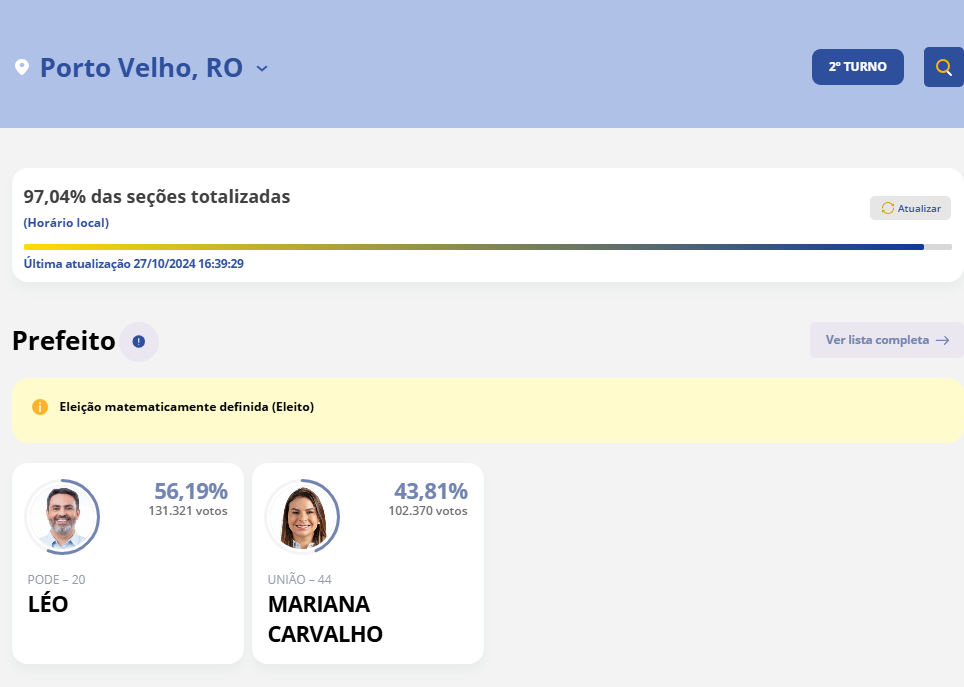 O ex-deputado federal Léo Moraes (Podemos) foi eleito prefeito de Porto Velho, com 97% das urnas apuradas.