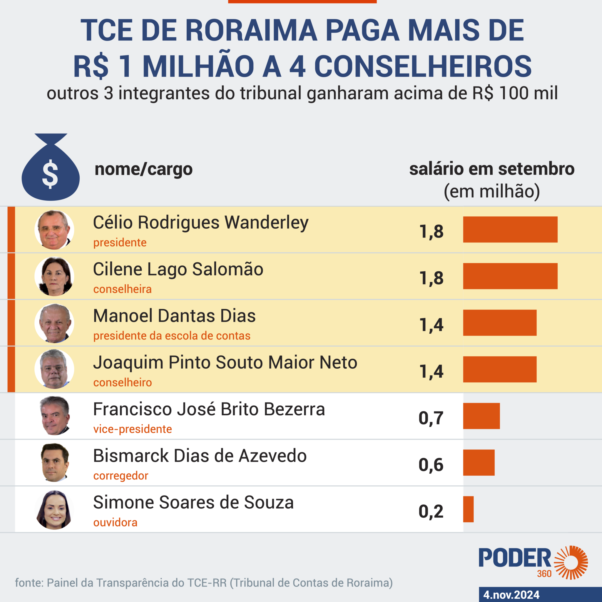 Em setembro de 2024, todos os conselheiros do Tribunal de Contas do Estado (TCE) de Roraima ultrapassaram o teto de remuneração. O presidente da instituição, Célio Rodrigues Wanderley, liderou a lista, com um recebimento de R$ 1,8 milhão.