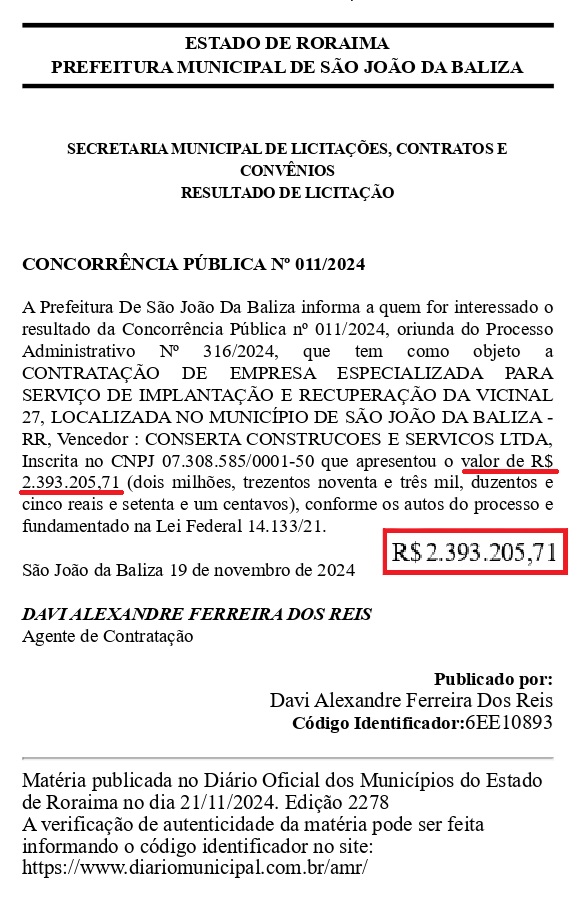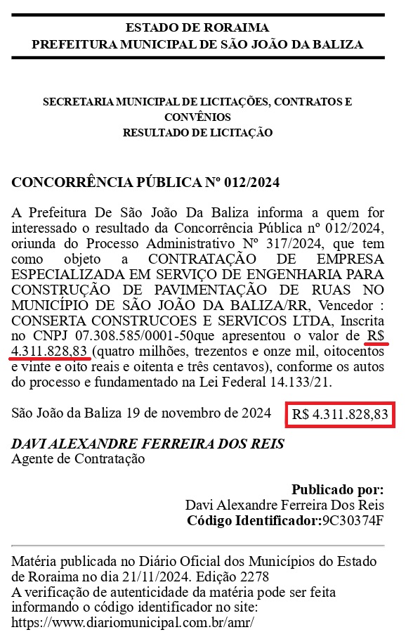 Já o segundo, vinculado à Concorrência Pública nº 012/2024, tem como objetivo a pavimentação de ruas urbanas, pelo valor de R$ 4.311.828,93. No entanto, a publicação não detalha o número de ruas ou regiões que serão beneficiadas pelas obras.
