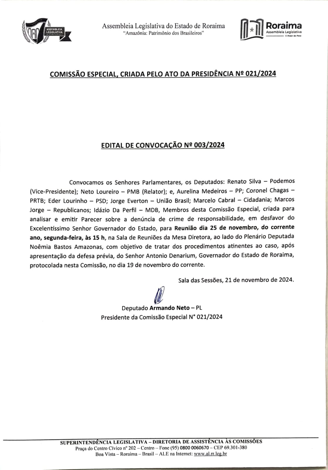 A defesa do governador Antonio Denarium (PP) no processo de impeachment será analisada pela Comissão Especial da Assembleia Legislativa de Roraima (ALE-RR) na próxima segunda-feira, 25. De acordo com o Edital de Convocação nº 003/2024, assinado pelo presidente da Comissão, deputado Armando Neto (PL), a reunião está marcada para ocorrer às 15h, na Sala de Reuniões da Mesa Diretora, ao lado do Plenário Deputada Noêmia Bastos Amazonas.