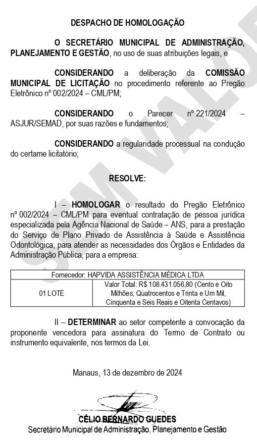 A Prefeitura de Manaus subsitituiu o Serviço de Assistência à Saúde do Município de Manaus (Manausmed) pelo plano privado da operadora Hapvida Assistência Médica Ltda., em um contrato anual de R$ 108,4 milhões. O secretário municipal de Administração, Planejamento e Gestão, Célio Bernardo Guedes, homologou a contratação, publicada no Diário Oficial de Manaus no último dia 13.