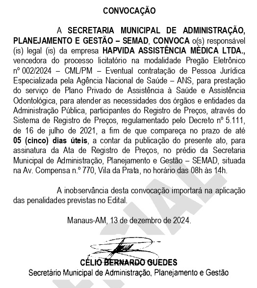 A Secretaria Municipal de Administração, Planjemento e Gestão convocou a Hapvida, que tem cinco dias úteis para comparecer à sede da pasta e assinar a Ata de Registro de Preços. Caso não cumpra o prazo, a empresa poderá enfrentar penalidades previstas no edital. A assinatura do contrato deve acontecer nos próximos dias, conforme exige a legislação.