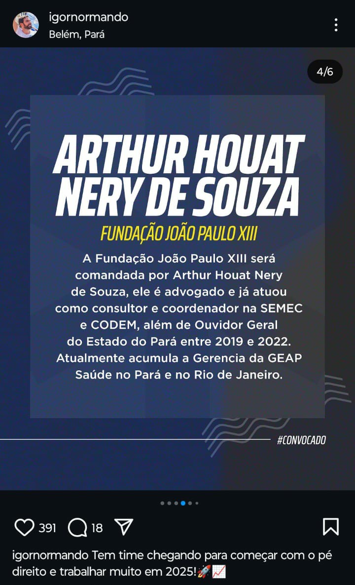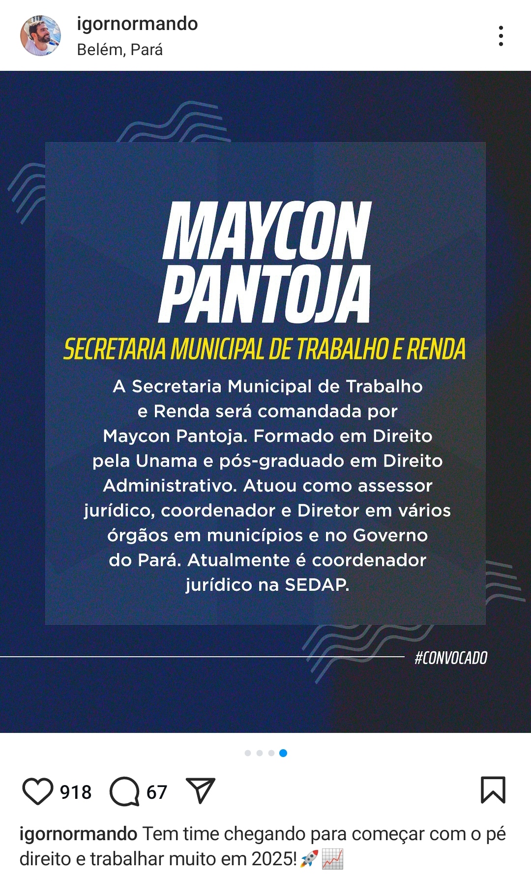 O prefeito eleito de Belém, Igor Normando (MDB), anunciou nesta terça-feira, 31, mais três nomes que irão compor o primeiro escalão de sua gestão, totalizando até agora 24 indicações para as secretarias e órgãos municipais. Os novos nomes são voltados para inclusão social, trabalho e renda, além de saúde.