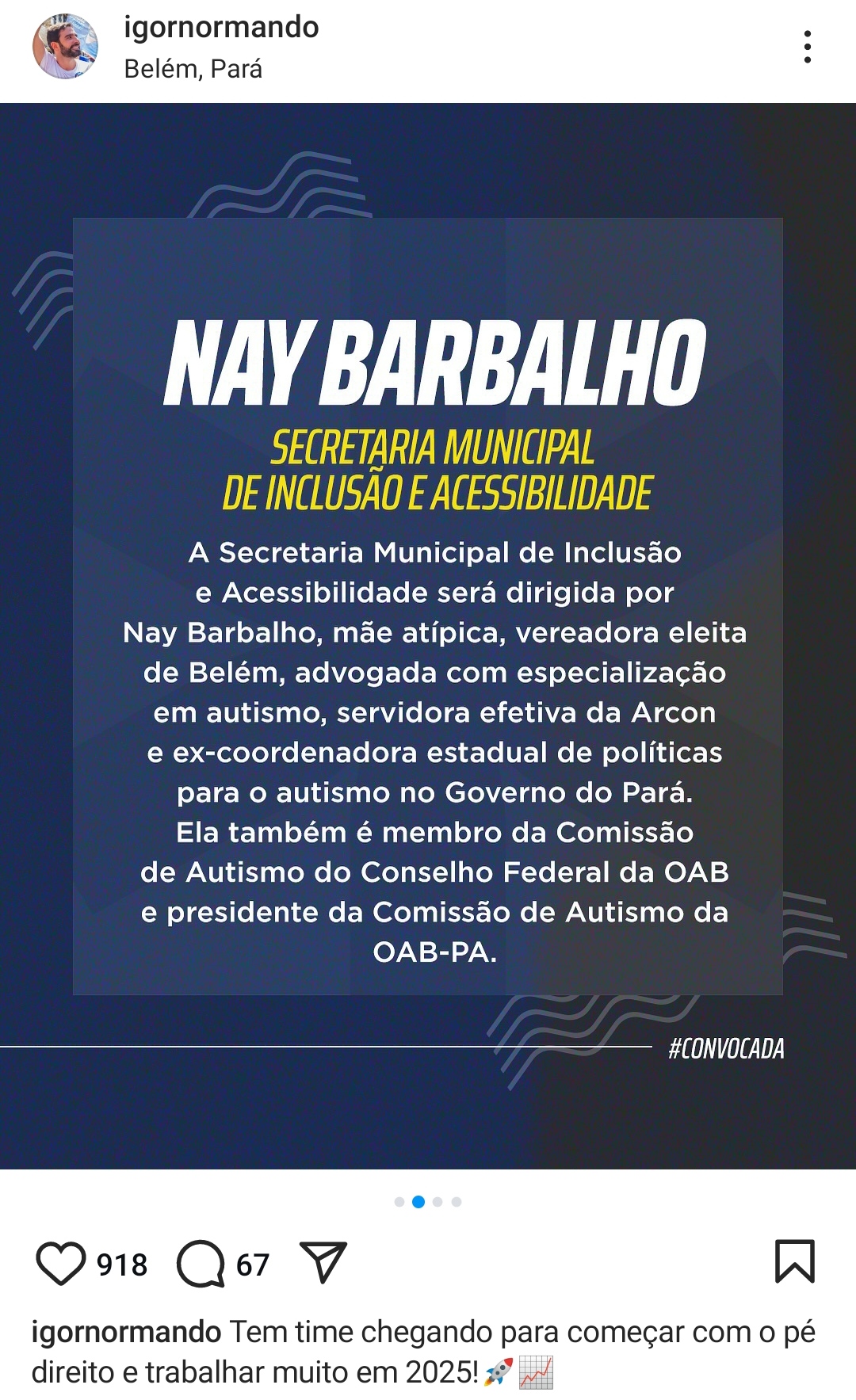 Advogada com especialização em autismo, Nay Barbalho é mãe atípica, vereadora eleita em Belém, servidora efetiva da Agência de Regulação e Controle dos Serviços Públicos do Estado do Pará (Arcon) e ex-coordenadora estadual de políticas para o autismo no Governo do Pará. Integra a Comissão de Autismo do Conselho Federal da OAB e preside a Comissão de Autismo da OAB-PA.