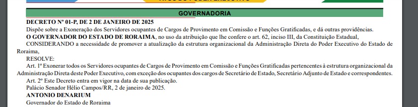 O governador Antonio Denarium (PP) determinou a exoneração de todos os servidores ocupantes de cargos comissionados e funções gratificadas na estrutura organizacional da Administração Direta do Poder Executivo. A medida foi oficializada por meio do Decreto nº 01-P, publicado no Diário Oficial do Estado desta quinta-feira, 2.