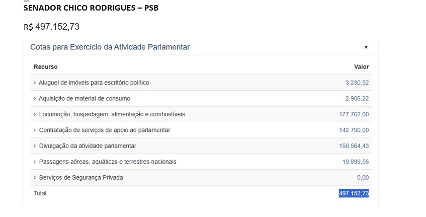 Na sequência, aparece o senador Chico Rodrigues (PSB), utilizando R$ 497.152,73 do cotão. Desse total, destacam-se o uso de mais de R$ 177 mil apenas em locomoção, hospedagem, alimentação e combustíveis, R$ 150. 564,43 na divulgação de atividade parlamentar e R$ 142.790,00 na contratação de serviços de apoio parlamentar.