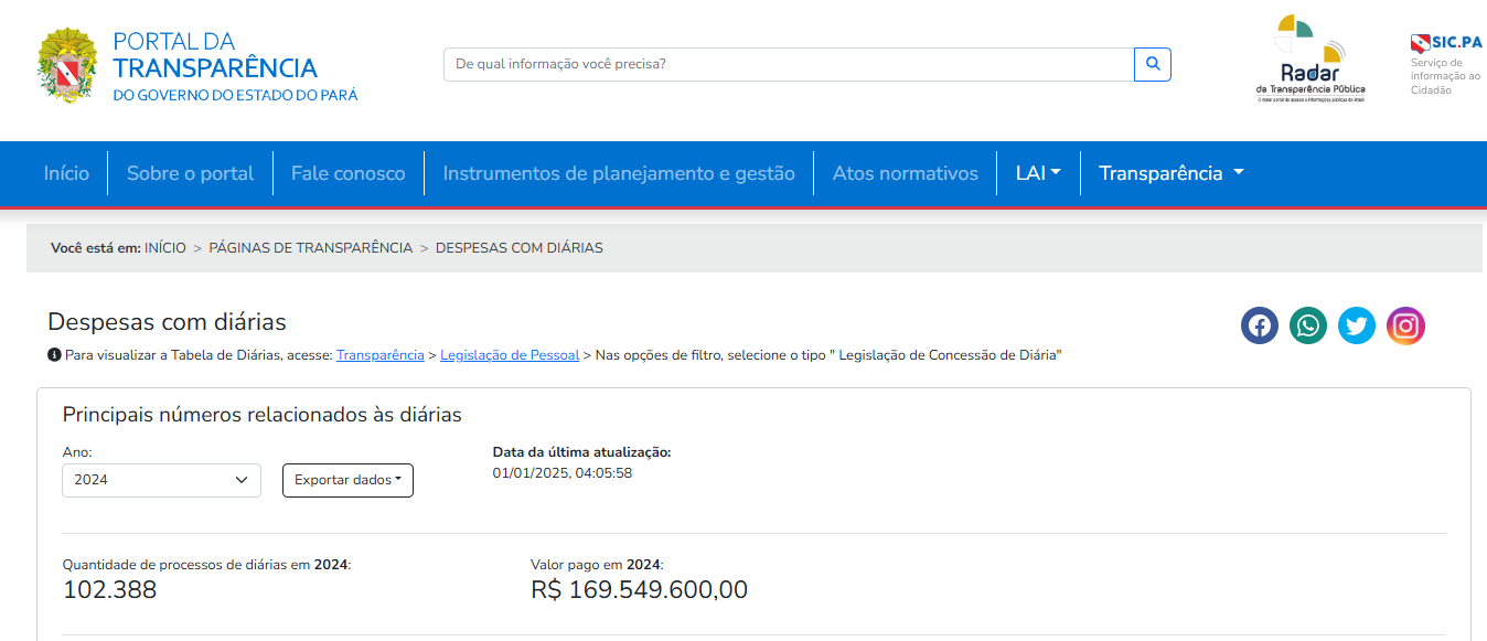 Conforme pesquisa do portal O Fato no Portal da Transparência do governo paraense, o montante total pago em 2024 foi de R$ 169.549.600,00. As diárias são destinadas a cobrir despesas extraordinárias com hospedagem, alimentação e locomoção urbana. Essas verbas são pagas aos funcionários antes de uma viagem, para cobrir os gastos do percurso.