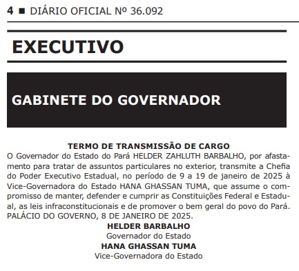A vice-governadora assumirá a chefia do Poder Executivo Estadual durante o período de 9 a 19 de janeiro. No termo de transmissão, Hana Tuma comprometeu-se a manter, defender e cumprir as Constituições Federal e Estadual, bem como as leis infraconstitucionais, além de promover o bem-estar do povo do Pará.
