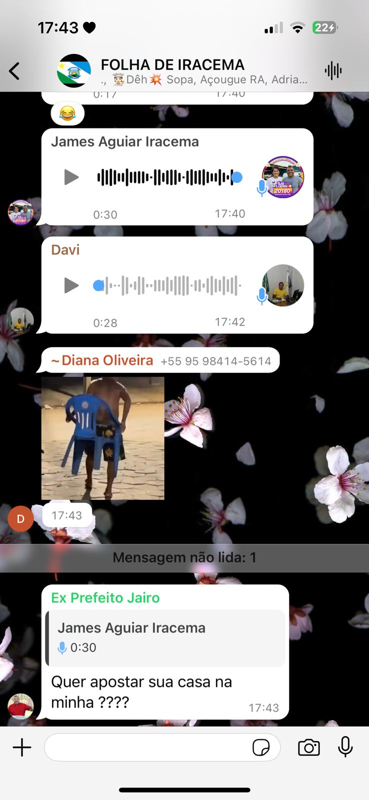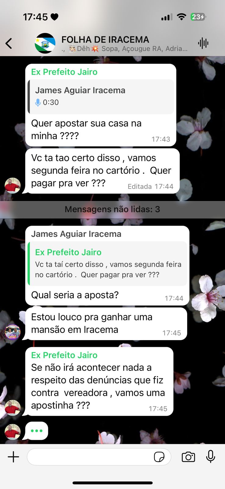 No grupo de WhatsApp “Folha de Iracema”, Jairo Ribeiro debocha dos eleitores: “Quer apostar sua casa na minha?”, questiona Ribeiro. Ele, então, é questionado por um eleitor: “Qual aposta seria?”.