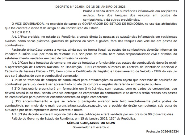 Em resposta à crise, o governo de Rondônia publicou o Decreto nº 29.954, que proíbe a venda de combustíveis em recipientes avulsos, como galões, garrafas de plástico ou vidro, em postos de combustíveis em todo o estado. A medida, que entra em vigor imediatamente e será válida por 90 dias, visa dificultar os ataques incendiários realizados pela facção.