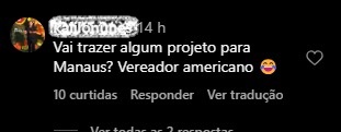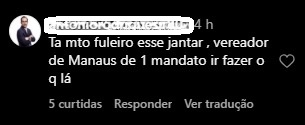 Um internauta questionou. “Vai trazer algum projeto para Manaus? Vereador americano”, ironizou. Outro comentou. “Tá muito fuleiro esse jantar, vereador de Manaus de 1 mandato ir fazer o que lá?”, questionou.