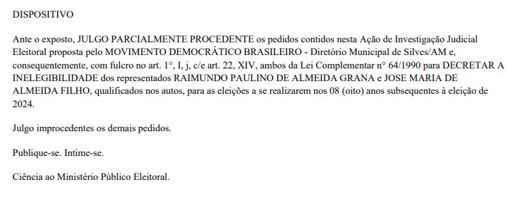 O prefeito de Silves, Paulino Grana (Republicanos), reeleito em 2024 com 68,31% dos votos válidos, e seu vice, José Maria de Almeida Filho (União Brasil), estão inelegíveis pelos próximos oito anos. A sentença foi proferida pela juíza eleitoral Tânia Mara Granito na sexta-feira, 20, após a análise de uma Ação de Investigação Judicial Eleitoral (AIJE) movida pelo Movimento Democrático Brasileiro (MDB).