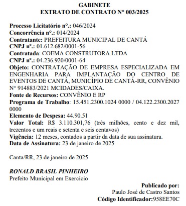 A Prefeitura do Cantá firmou um contrato no valor de R$ 3.110.301,76 para a construção de um Centro de Eventos no município. O extrato do contrato foi publicado no Diário Oficial dos Municípios de Roraima nesta quarta-feira, 29.