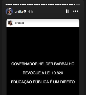 Além de criticar a legislação, a atriz mencionou a atuação do secretário de Educação, Rossieli Soares, na condução da política educacional. “Lamento muito que o Secretário de Educação @Rossieli Soares NÃO tenha nos representado diante dessa causa tão nobre”, declarou.