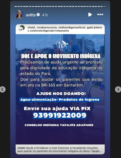 No story seguinte, a cantora compartilhou uma publicação do Conselho Indígena Tapajós e Arapiuns (Cita) que solicita doações em apoio ao movimento indíigena que lidera os protestos na Secretaria de Educação do Estado do Pará (Seduc).
