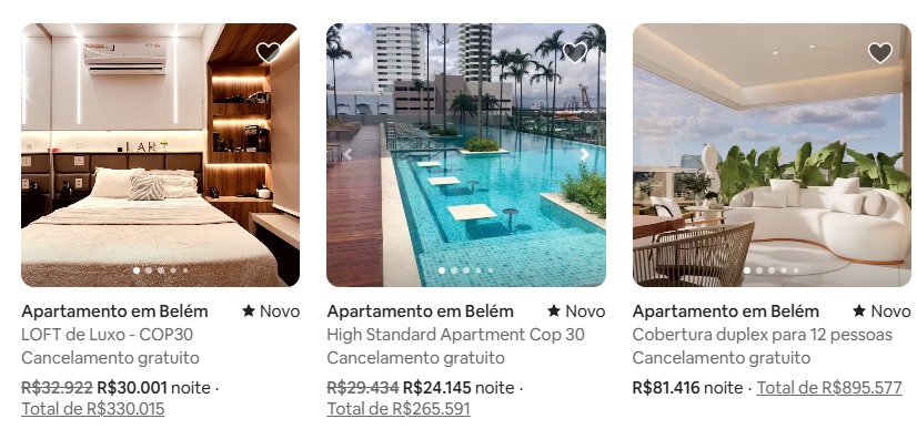 Nas plataformas Airbnb e Booking.com, a reportagem do Portal O Fato encontrou anúncios com preços altíssimos. Um apartamento duplex para 12 pessoas na região central de Belém, por exemplo, está com diária de R$ 81.416,00, totalizando R$ 895.577,00 para os 11 dias do evento. Já um loft na mesma plataforma tem diária de R$ 30.001,00, somando R$ 330.015,00.