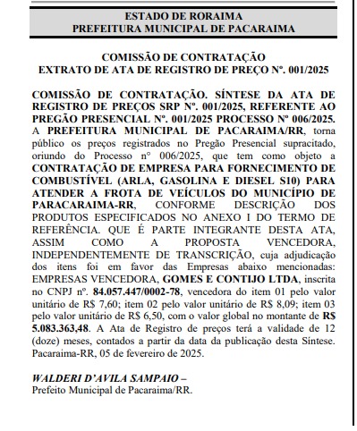 O contrato, assinado por meio da Ata de Registro de Preço n.º 001/2025, foi publicado no Diário Oficial dos Municípios de Roraima (DOM-RR) desta quinta-feira, 6, e terá validade de 12 meses.