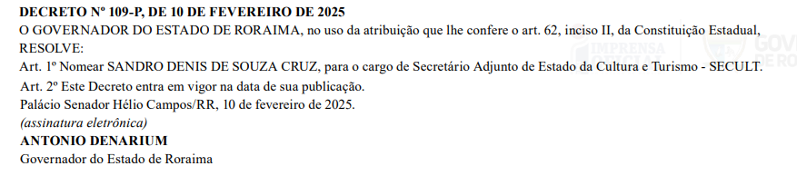 O governador Antonio Denarium (PP) nomeou o ex-vereador de Boa Vista, Sandro Baré (Republicanos), para o cargo de secretário adjunto da Cultura e Turismo (Secult). A nomeação foi oficializada no Diário Oficial do Estado do última dia 10.