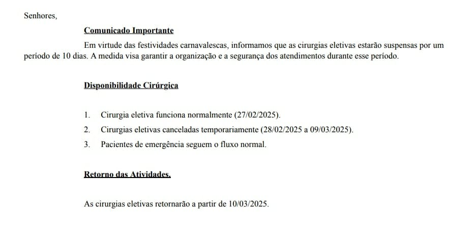 Conforme o documento, os procedimentos eletivos serão realizados normalmente até o dia 27 de fevereiro, com suspensão temporária no período informado. O atendimento a pacientes em situação de emergência seguirá sem alterações. As cirurgias eletivas serão retomadas a partir de 10 de março.