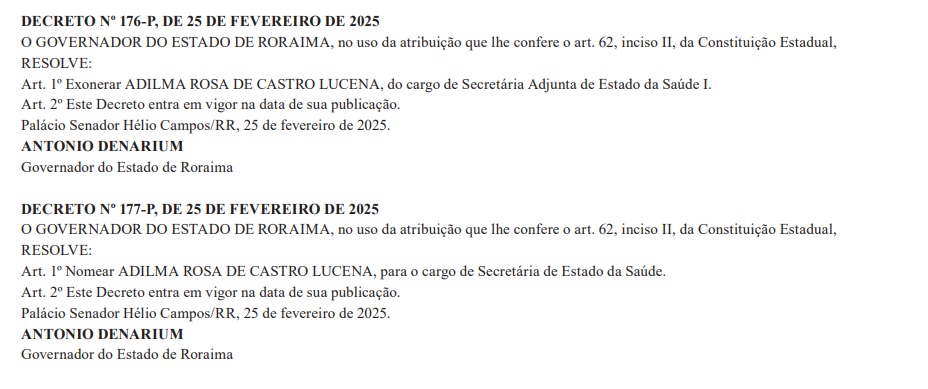 O governador Antonio Denarium (PP) nomeou Adilma Rosa de Castro Lucena como a nova secretária estadual de Saúde de Roraima. A decisão foi publicada no Diário Oficial desta terça-feira, 25, por meio do Decreto nº 177-P, que oficializa sua nomeação após a exoneração de Cecília Lorenzon da pasta. Antes da promoção, Adilma exercia a função de primeira secretária-adjunta da Sesau desde 2021.