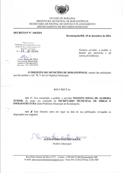 À Folha de Boa Vista, o empresário Neozito Sousa de Almeida Junior afirmou que não ocupa mais o cargo de secretário de Obras de Rorainópolis e apresentou o decreto de exoneração.