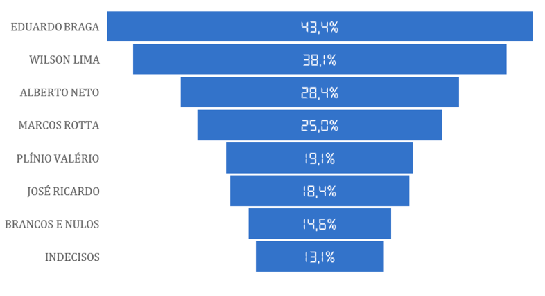 No interior do Estado, o desempenho expressivo de Braga (66,3%) e Lima (50,4%) foi determinante para consolidar a vantagem de ambos sobre Alberto Neto, que lidera na capital com 35,4% das intenções de voto em Manaus.