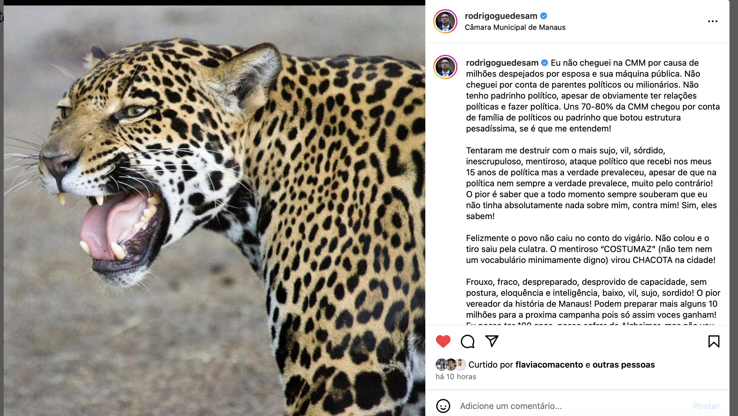 O vereador Rodrigo Guedes classifica ainda o marido da deputada como o pior vereador da história de Manaus. “Podem preparar mais alguns 10 milhões para a próxima campanha pois só assim vocês ganham! Eu posso ter 100 anos, posso sofrer de Alzheimer, mas não vou NUNCA esquecer disso! Deus me protegeu! À você, cidadão, que não caiu na conversa pra BOI dormi o meu muitíssimo obrigado por ter ficado na trincheira da verdade e guerreado pelo justo! Bem aventurados os que tem fome e sede de justiça!”, escreveu.