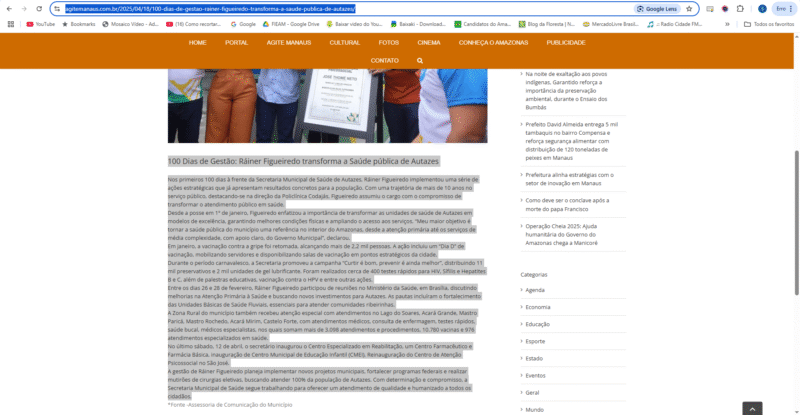 Em trechos como “Nos primeiros 100 dias à frente da Secretaria Municipal de Saúde de Autazes, Ráiner Figueiredo implementou uma série de ações estratégicas que já apresentam resultados concretos para a população”, a matéria reforça a ideia de que o secretário seria o único responsável pelas ações.