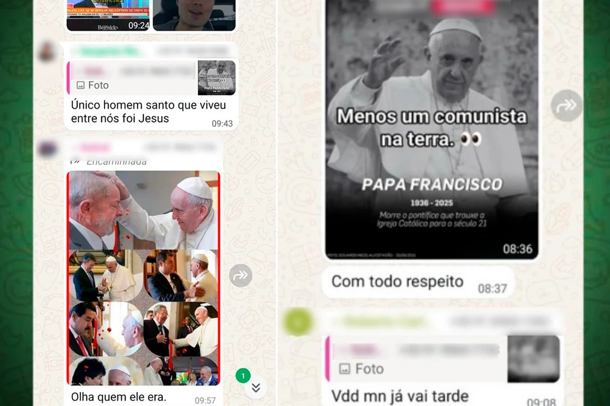 A informação foi publicada pelo portal Metrópoles, que teve acesso às mensagens. Em uma das montagens, o pontífice aparece com a frase “Menos um comunista na terra”, acompanhada das datas “1936 – 2025”, em tom de escárnio.