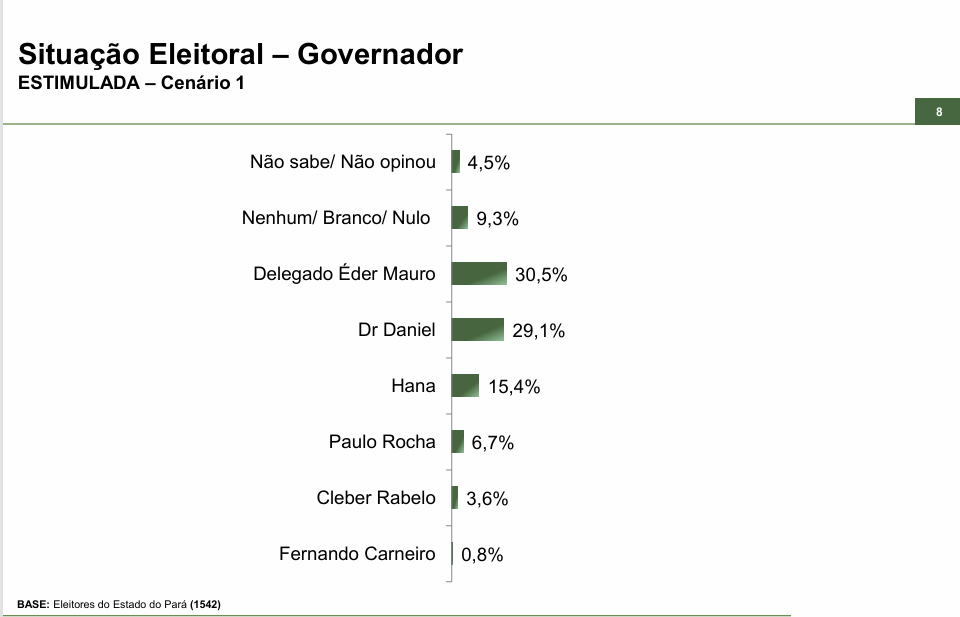 No cenário estimulado, o prefeito de Ananindeua, Dr. Daniel, aparece em segundo lugar, com 29,1% da preferência do eleitorado. Já a vice-governadora Hana Ghassan (MDB) soma 15,4% das intenções de voto.