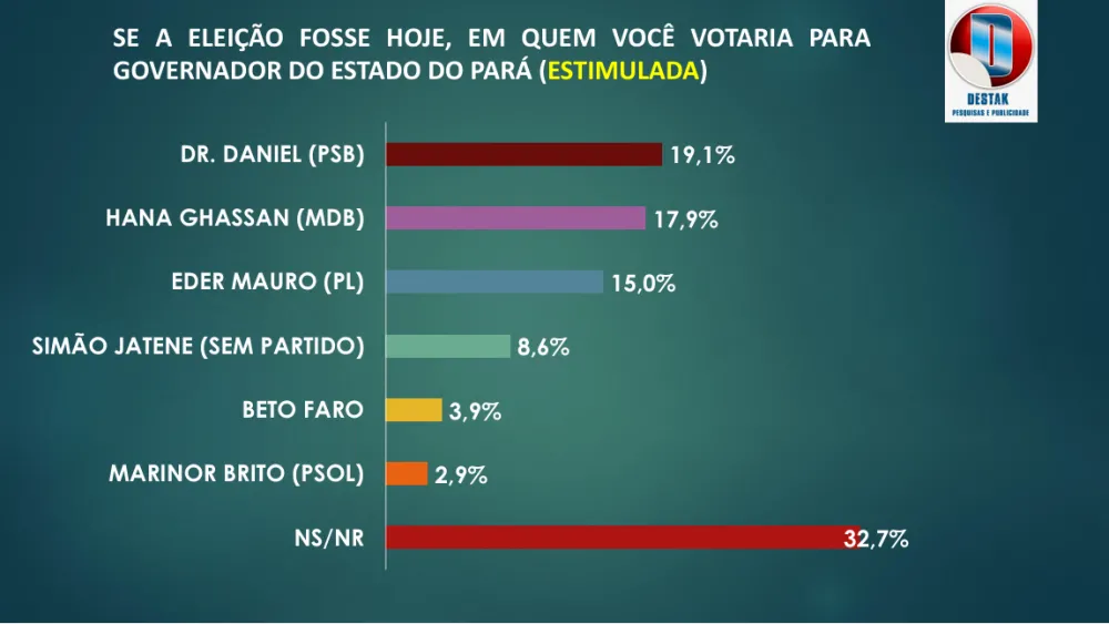 No cenário estimulado, em que os nomes dos pré-candidatos são apresentados, Dr. Daniel lidera com 19,1% das intenções de voto, seguido por Hana Ghassan, com 17,9%. Éder Mauro aparece em terceiro lugar, com 15%, enquanto Simão Jatene soma 8,6%, Beto Faro tem 3,9% e Marinor Brito, 2,9%. O percentual de indecisos (NS/NR) permanece elevado, com 32,7%.