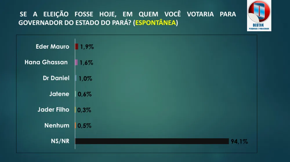 Na pesquisa espontânea, quando os nomes dos pré-candidatos não são apresentados aos entrevistados, 94,1% afirmaram não saber ou preferiram não responder. Entre as menções, 1,9% citaram Éder Mauro (PL), 1,6% mencionaram Hana Ghassan (MDB), 1% apontaram Dr. Daniel, e 0,6% lembraram de Simão Jatene. Jader Filho foi citado por 0,3% dos entrevistados, enquanto 0,5% disseram não votar em nenhum.