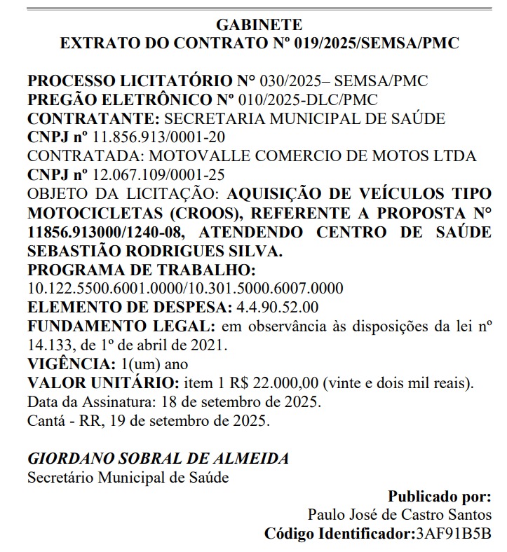 A Prefeitura de Cantá firmou contrato de cerca de R$ 242 mil para a aquisição de motocicletas destinadas ao atendimento do Centro de Saúde Sebastião Rodrigues Silva. A publicação prevê a compra de 11 veículos do tipo cross, com preço unitário de R$ 22 mil, conforme contrato nº 019/2025/SEMSA/PMC, publicado no Diário Oficial dos Municípios de Roraima (DOM-RR) desta segunda-feira, 22.