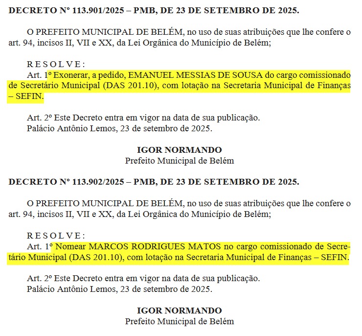 O prefeito de Belém, Igor Normando (MDB), alterou o comando da Secretaria Municipal de Finanças (Sefin). O auditor fiscal Marcos Rodrigues Matos assumiu a pasta no lugar de Emanuel Messias de Sousa, que deixou o cargo a pedido e retornou à Secretaria de Estado da Fazenda (Sefa), onde atua como fiscal de Receitas Estaduais.