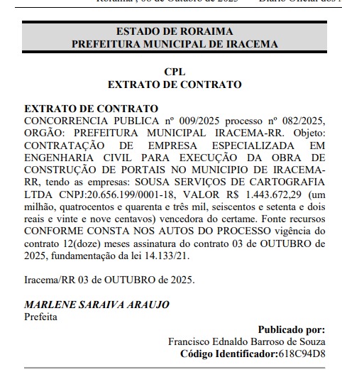 A construção de portais de entrada no município de Iracema vai custar R$ 1.443.672,29 aos cofres da prefeitura. A obra será executada pela empresa SOUSA Serviços de Cartografia Ltda (Multiline), vencedora da Concorrência Pública nº 009/2025, conforme extrato de contrato publicado no Diário Oficial dos Municípios de Roraima (DOM-RR) desta segunda-feira, 6.