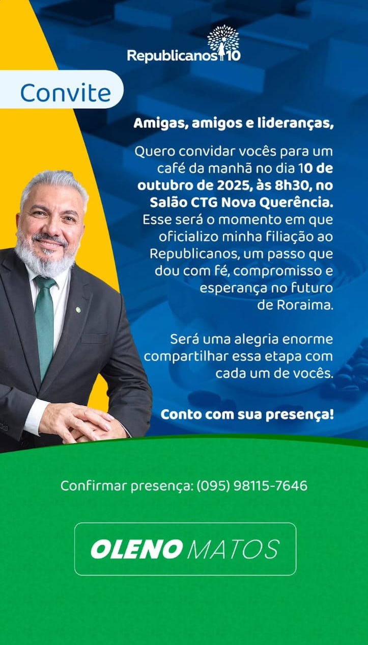 No convite, ele informa que o momento marca o passo de sua filiação ao partido, “com fé, compromisso e esperança no futuro de Roraima”, e convida amigos, lideranças e apoiadores a participarem do café da manhã.