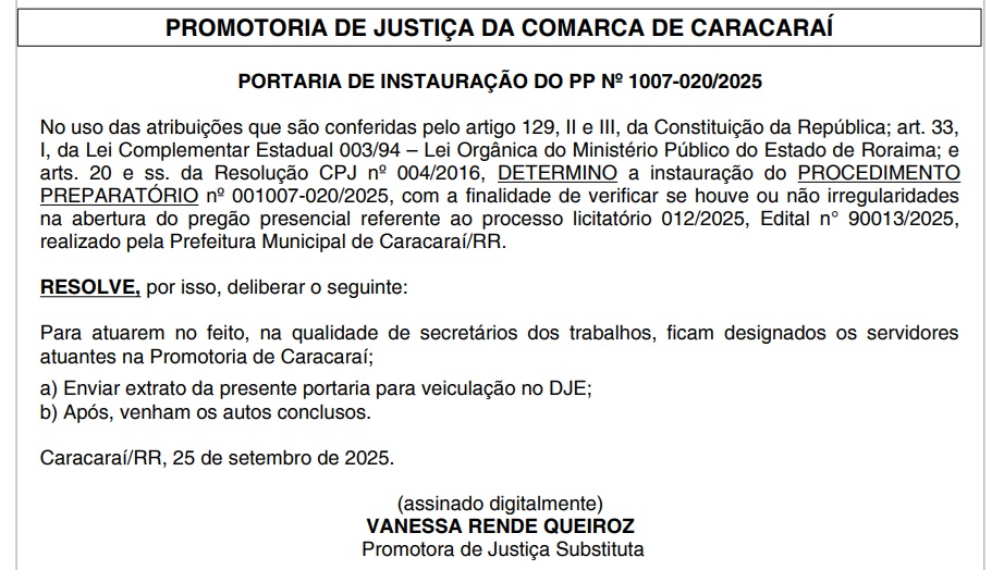 A investigação foi aberta pela Promotoria de Justiça de Caracaraí, comandada pela promotora Vanessa Rende Queiroz, por meio da Portaria nº 001007-020/2025, publicada no Diário Eletrônico do MPRR da quinta-feira, 9. O Ministério Público vai apurar como ocorreu a divulgação do edital e se o processo garantiu transparência e igualdade de condições para outras possíveis interessadas.