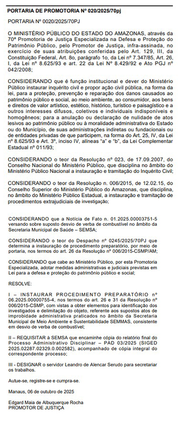 A portaria de instauração, datada de 6 de outubro de 2025, foi publicada com base em uma Notícia de Fato nº 01.2025.0003751-5, que aponta indícios de irregularidades no uso de recursos destinados à compra e ao abastecimento de combustíveis pela secretaria.