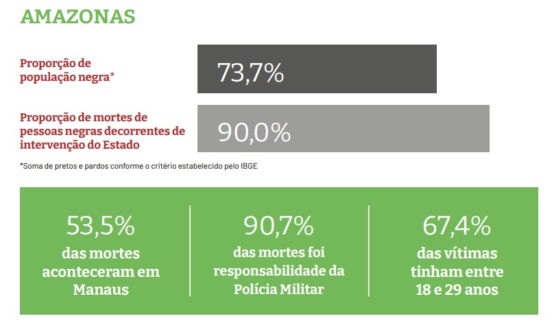 O relatório também mostra que 90% das vítimas identificadas eram negras, enquanto mais da metade dos registros foi entregue sem informação racial. Mesmo sendo o estado com maior proporção de população indígena entre os analisados, o levantamento aponta zero por cento de vítimas indígenas o que os pesquisadores apontam como possível empardecimento estatístico.