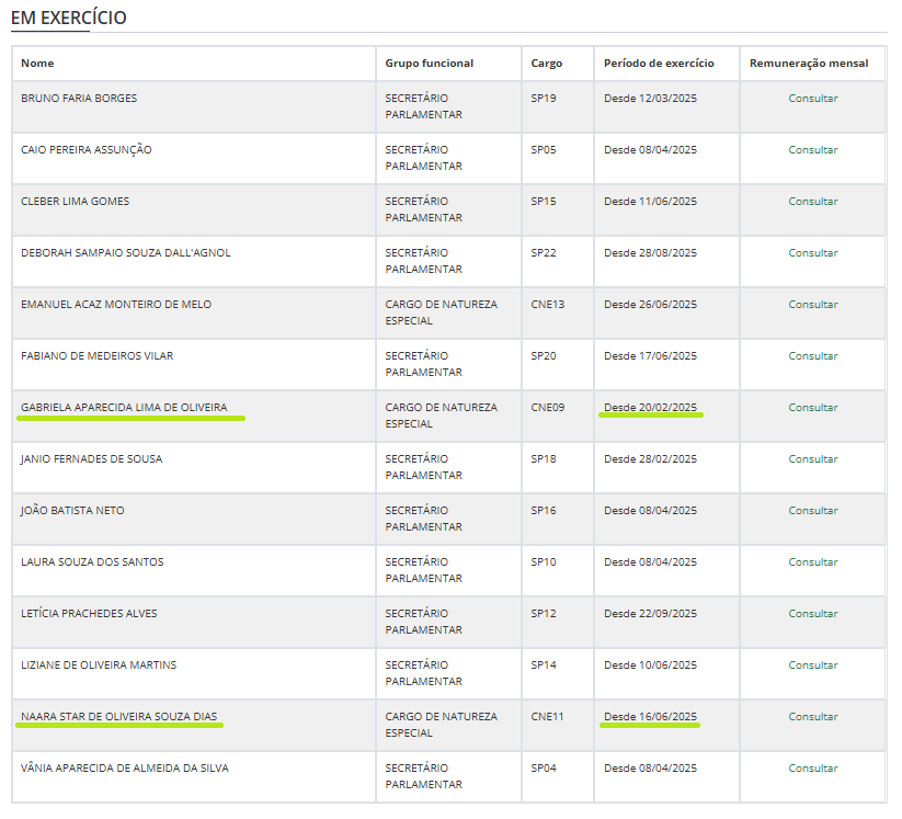 As outras duas parentes continuam vinculadas ao gabinete. Naara Star de Oliveira Souza Dias, cunhada, segue ocupando um Cargo de Natureza Especial desde julho de 2022 e já recebeu mais de R$ 386,5 mil. Gabriela Aparecida de Lima Oliveira, concunhada, também permanece listada como servidora e soma R$ 532,7 mil em duas passagens pelo gabinete.