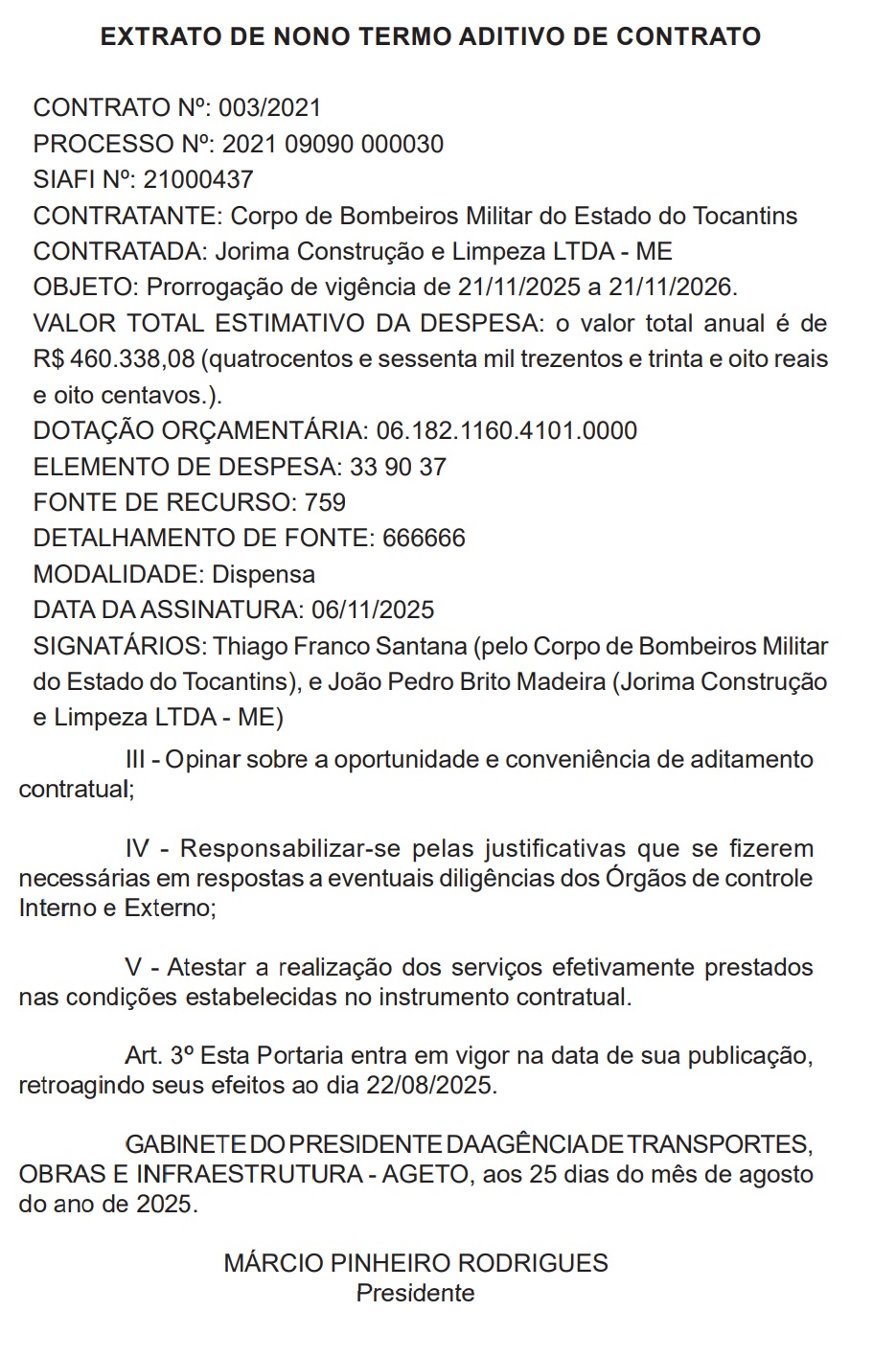 A renovação estende a vigência até 21 de novembro de 2026, no valor anual de R$ 460.338,08. O termo foi assinado em 6 de novembro pelo tenente-coronel Thiago Franco Santana, representando o Corpo de Bombeiros, e por João Pedro Brito Madeira, em nome da empresa.