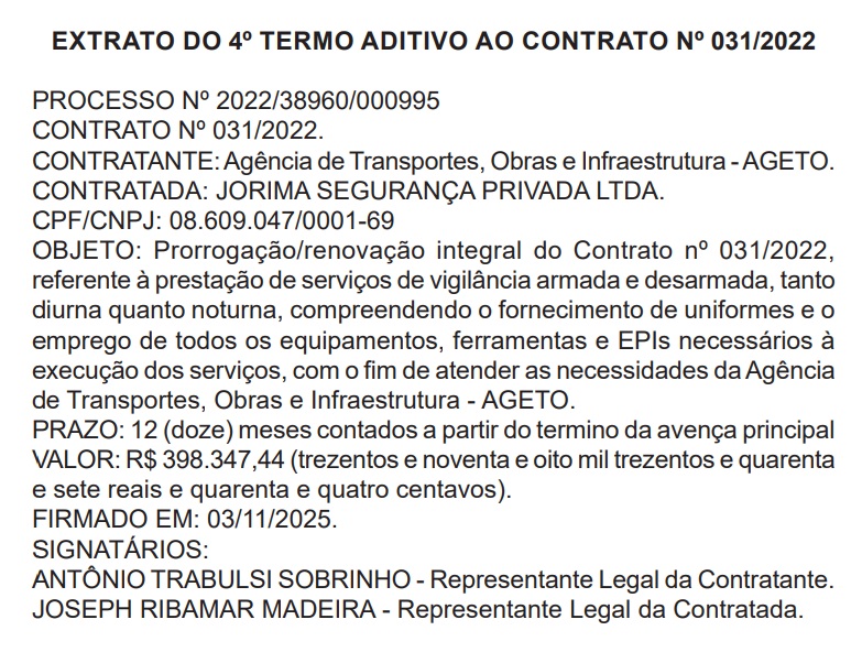 A Agência de Transportes, Obras e Infraestrutura (Ageto) também manteve a relação contratual com o grupo ao renovar o contrato com a Jorima Segurança Privada Ltda., responsável por serviços de vigilância armada e desarmada.