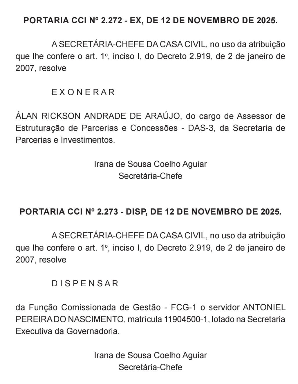 O Governo do Tocantins exonerou, na quarta-feira, 12, o assessor de Estruturação de Parcerias e Concessões da SPI, Álan Rickson Andrade de Araújo, e o servidor da Secretaria Executiva da Governadoria, Antoniel Pereira do Nascimento, ambos citados no relatório da Polícia Federal que embasou a Operação Nêmesis, deflagrada no mesmo dia para investigar embaraço às apurações sobre desvio de recursos da pandemia.