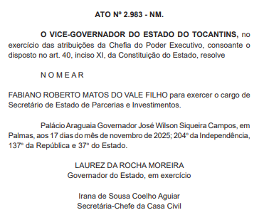 - Fabiano Roberto Matos do Vale Filho foi nomeado para o cargo de Secretário de Estado de Parcerias e Investimentos (Ato Nº 2.983).