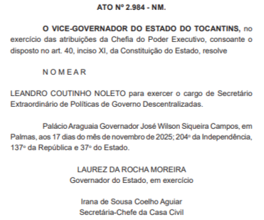 - O vereador de Colinas Leandro Coutinho Noleto (PSDB) assumirá a Secretaria Extraordinária de Políticas de Governo Descentralizadas (Ato Nº 2.984).