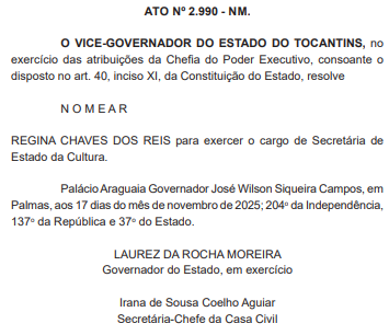 Em atos oficiais publicados no Diário Oficial do Estado, desta segunda-feira (17), o governador do Tocantins em exercício, Laurez da Rocha Moreira (PSD), anunciou a nomeação de três novos secretários. As nomeações foram formalizadas por meio dos Atos Nº 2.983, 2.984 e 2.990.