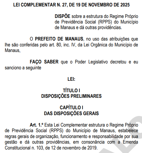 Foi sancionada nesta quarta-feira (19) pelo prefeito de Manaus, David Almeida (Avante), a lei que altera o regime previdenciário do funcionalismo municipal. A Lei Complementar nº 27/2025 foi publicada no Diário Oficial do Município (DOM).