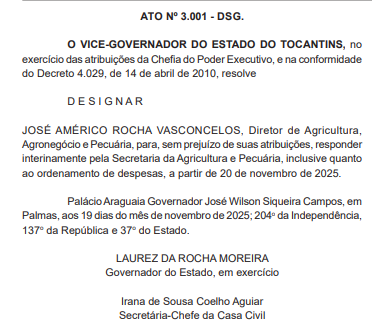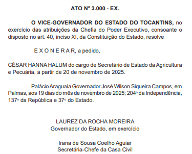O Governador do Tocantins em exercício, Laurez da Rocha Moreira (PSD), exonerou, a pedido, o secretário César Hanna Halum do cargo de titular da Secretaria de Estado da Agricultura e Pecuária. A decisão foi formalizada no Ato nº 3.000 – EX., publicado no Diário Oficial do Estado de 19 de novembro de 2025, com efeitos a partir do dia 20 de novembro.
